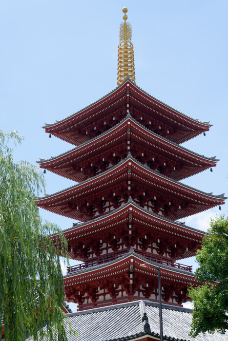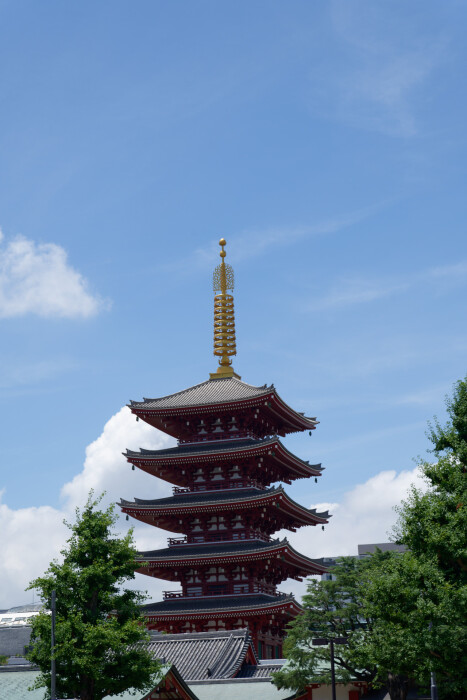 二天門から浅草寺の境内に入ると、五重塔が見えてきます。こちらは昭和48年(1973年)の再建とのこと。塔は仏舎利を奉安したインドのストゥーパを起源とするそうです。そういえば、池上本門寺にも五重塔がありましたね。