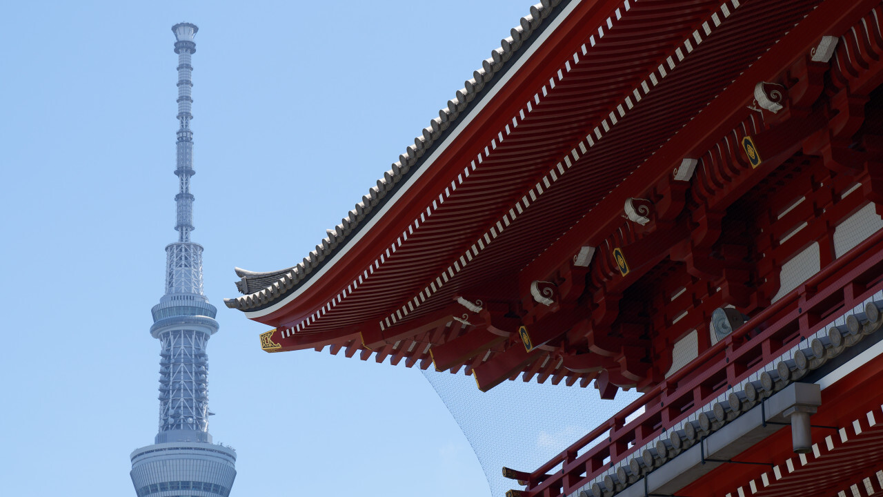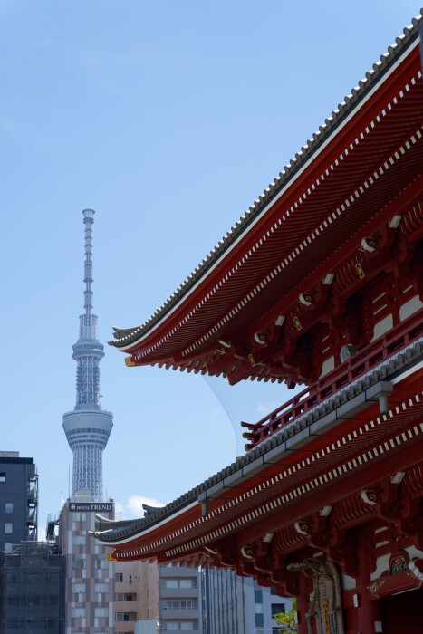 スカイツリーは境内からもちらちらと見ることができます。時代の異なる建築様式が対比できて面白い。
