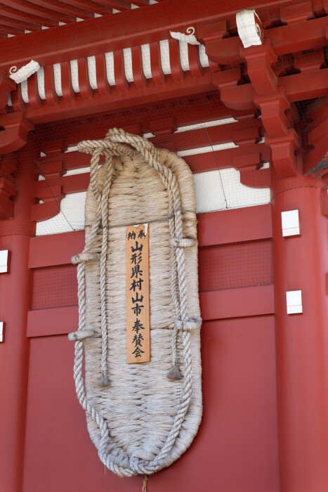 宝蔵門に掲げられている大わらじです。このわらじは、山形県村山市楯岡荒町の町内会がおよそ10年に一度奉納しているとのこと。昭和16年に始まり、現在は8代目だそうです。