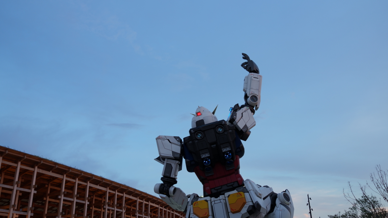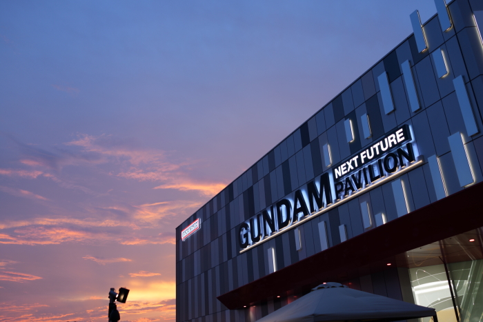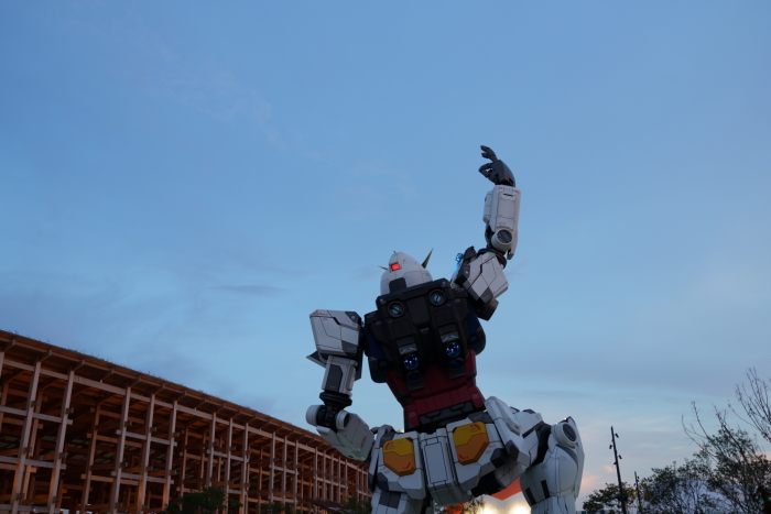 パビリオン体験後は、ガンダムの背中がお出迎えしてくれます。スモークの演出があったり、未来の世界で普通にあるような広告が掲示されていたりと、パビリオンの外も趣向が凝らされていて楽しめました。