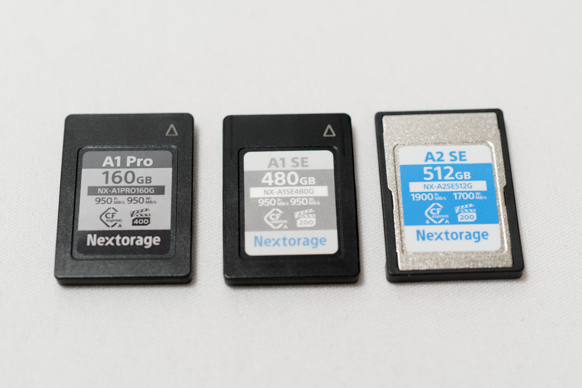手持ちのCFexpressカードと並べてみました。A1 Proは転送速度では劣るものの、VPG400で400MB/sの最低速度保証があります。静止画撮影だとバッファが入った間欠転送なので、VPG200と400であまり性能差は感じられないかな。