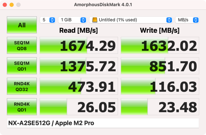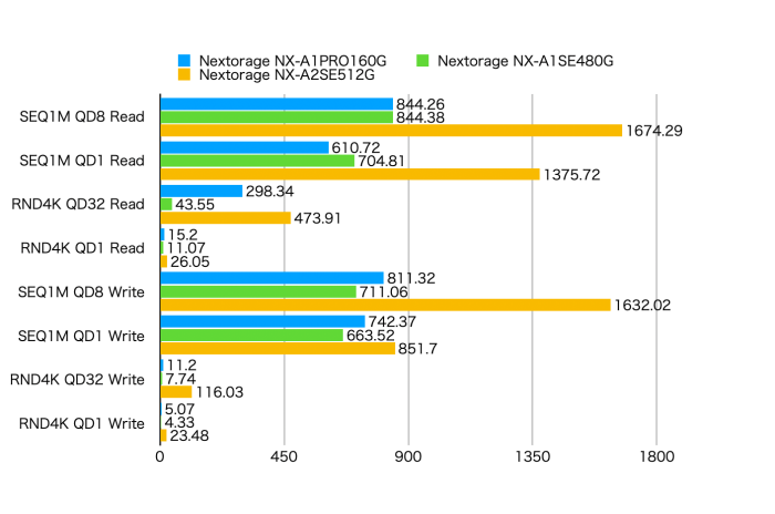 転送速度測定のためにベンチマークをとってみました。カードリーダーはNX-SA1PROです。シーケンシャルリード、ライトともに1600MB/sで、カタログスペックには及ばないものの、CFexpress 2.0対応カードに比べると高速です。