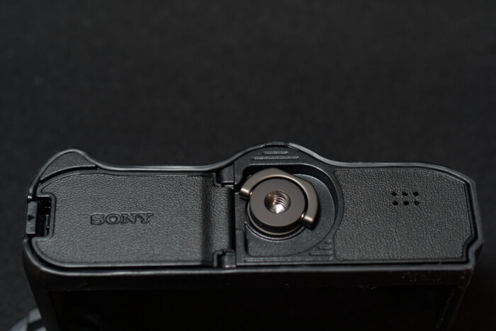 ボディケースを装着した状態でバッテリーとメモリーカードにアクセスできるよう、一部が開放できるようになっています。USBやHDMIケーブルの抜き差し、その他各部操作にも支障がないように考えられています。さすが純正。