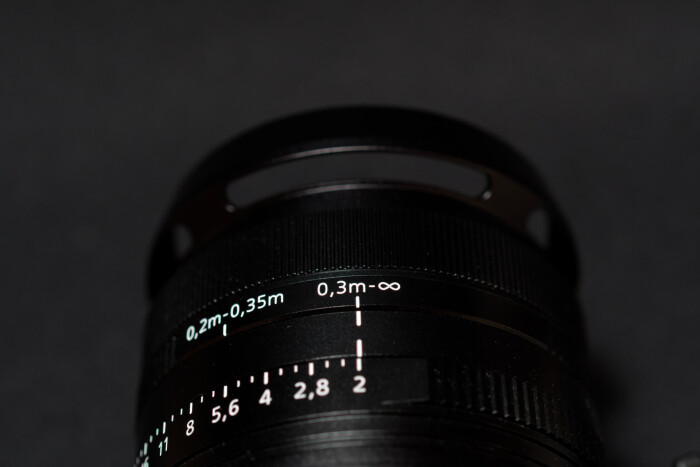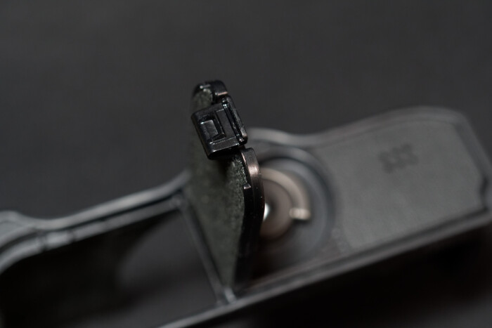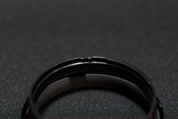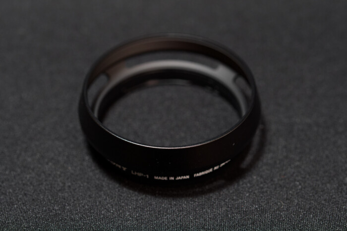 レンズフードにはスリットが開けられています。外付けの光学ファインダーならともかく、EVFならスリットがあろうがなかろうが大差はないのですが、こういうのはロマンなので。レンズフードそのものについても、遮光などの光学的な効果というよりは、レンズ保護や見た目の効果の方が狙いどころでしょう。
