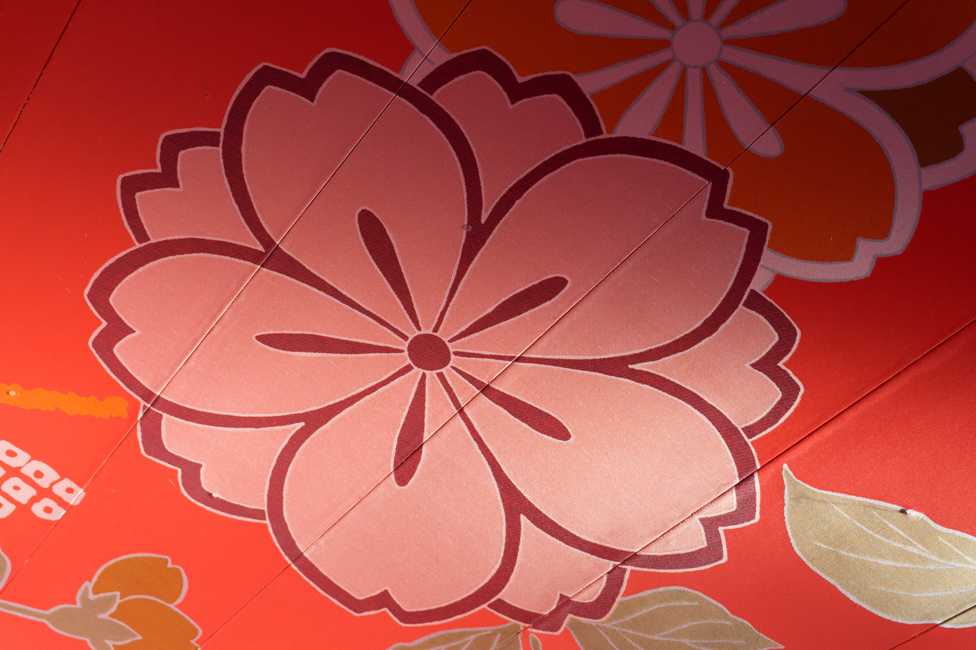 鮮やかな赤が特徴的な外観です。こちらは西陣織で構成されています。外側は防水加工されているとのこと。