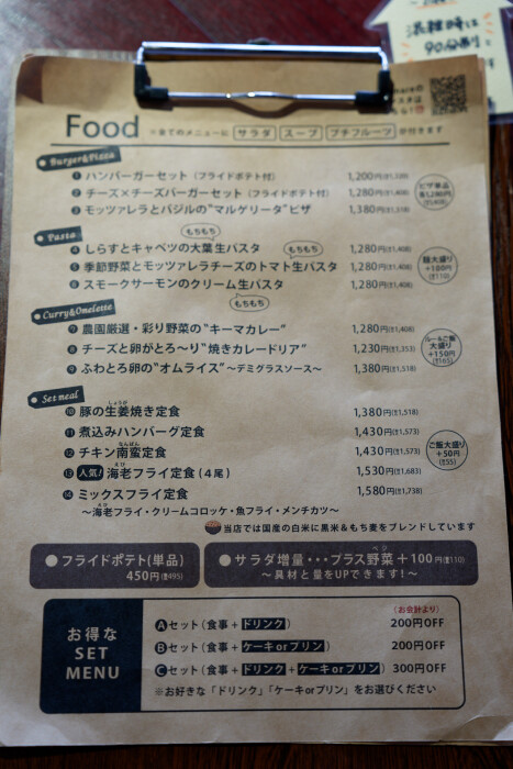 フードメニューです。定食、パスタ、カレーなど色とりどりの多彩なラインナップです。