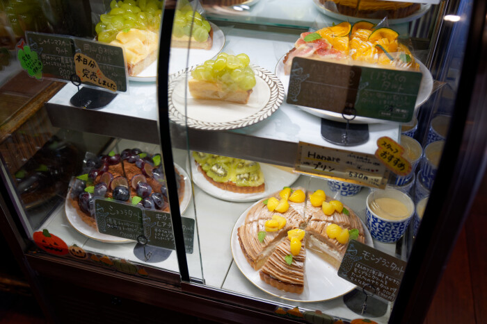 ケーキやタルトはショーケースから選択します。フルーツ農園の運営だけあって、フルーツが美味しそうです。シャインマスカットは定番ですね。