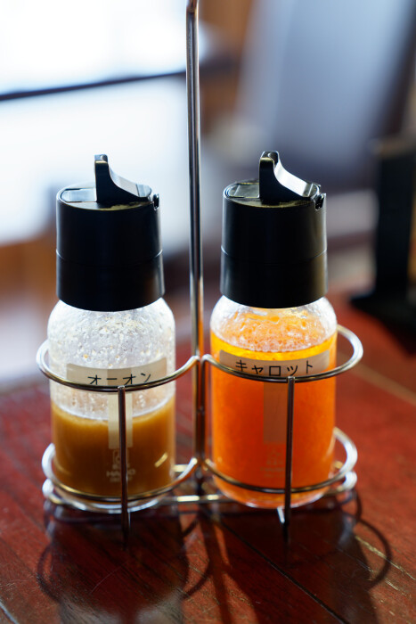 あれこれ迷って注文を決定。テーブルを見回すと、サラダ用のドレッシングが目に入りました。オニオンとキャロットの2種類で、サラダが美味しくいただけそうです。