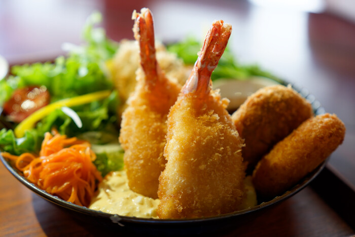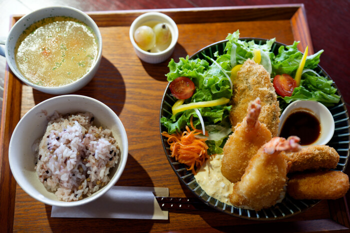 海老フライは、そのままではなく開きになったタイプでした。ちょっと珍しい。たっぷりのタルタルソースにつき立っている様子が、どことなくユーモラスです。どれも揚げたてのサクサクで熱々です。サラダは瑞々しく、ドレッシングによく合います。
