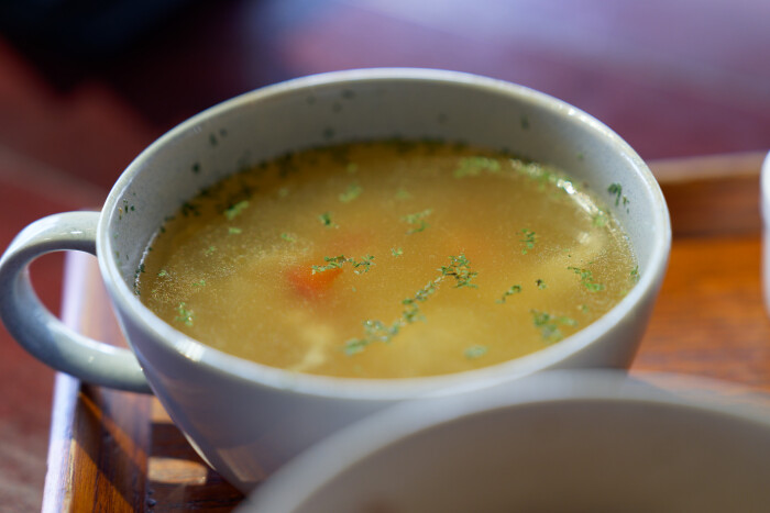 スープはコンソメベースに野菜や卵の入ったやさしい味のスープでした。