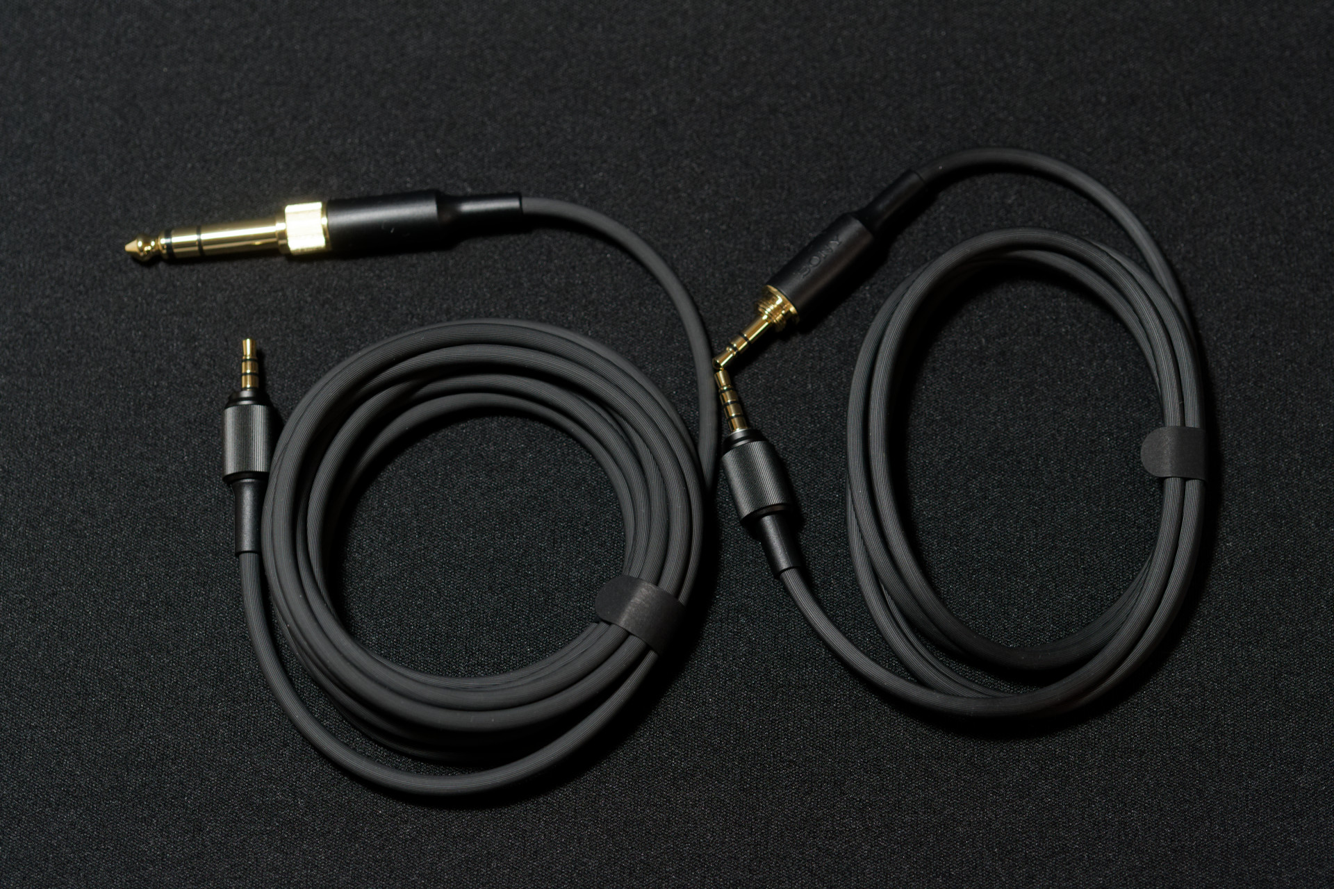 付属ケーブルは、6.3mmステレオジャックで2.5mのものと、3.5mmステレオジャックで1.2mのものが付属します。据置機器だけでなく、ポータブル機器での利用が想定されていて心憎い配慮です。