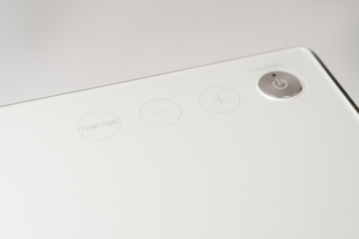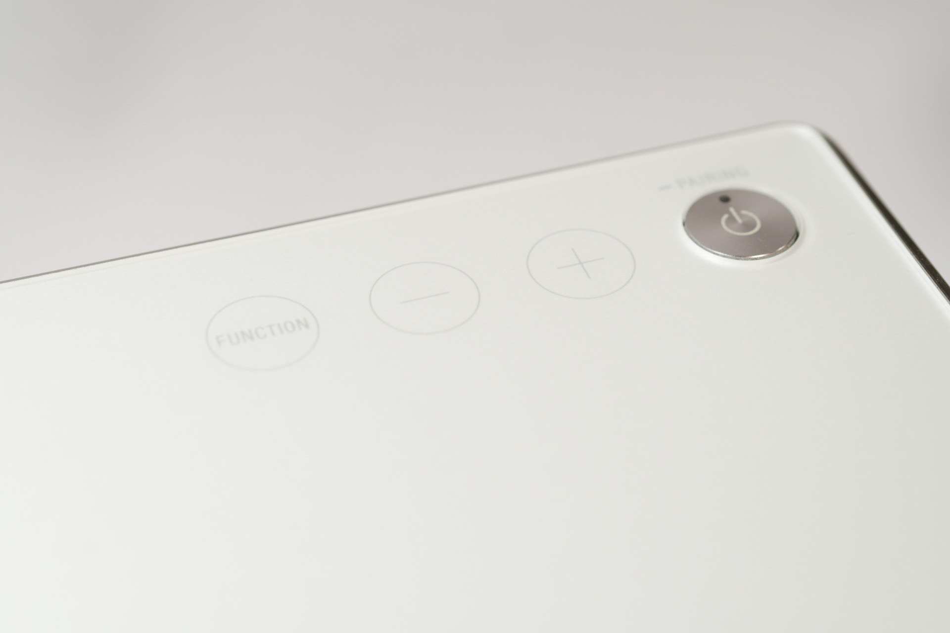 天面の操作系は右奥に集中しています。電源ボタンのみが物理ボタンで、入力切り替えと音量調整はタッチセンサーになっています。