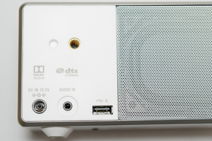 背面端子は充実しています。背面左側には電源とオーディオ入力、それにUSB-Aが配置されています。据置のため、コンパクトながら大容量のACアダプターで駆動します。USB-AはウォークマンやUSBメモリ用ですね。