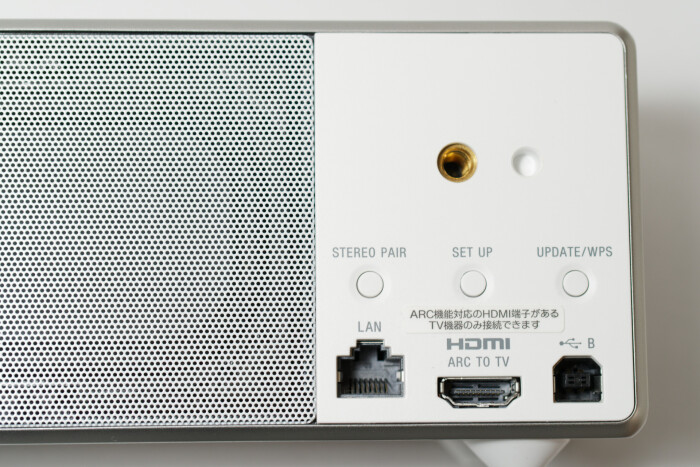 背面右側には操作ボタンと有線LAN、HDMI、USB-Aホスト側が配置されています。HDMIはARC対応で、TVの音声を本機から出力できます。TV台に取り付けるためのネジ穴が開いていて、TVと一緒に使って欲しい意図を感じます。私の場合も、TV音声の高音質化が目的の一つでした。