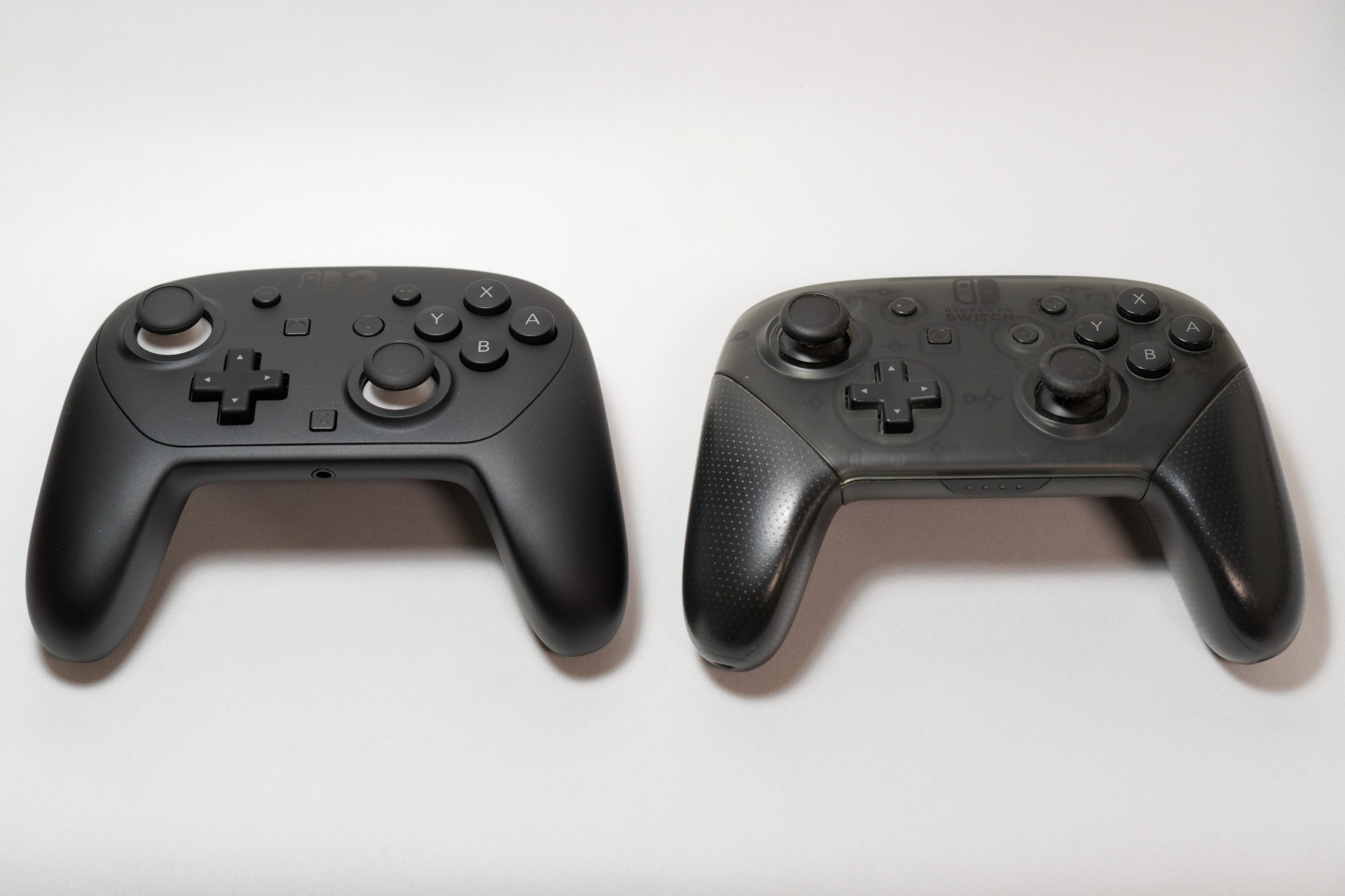 前作のProコントローラーと並べてみました。スティック操作時の音が静かになったり、操作部のパネルが半透明から黒になったり、パーツの繋ぎ目が手に触れないようになったりと、細かい作りが改良されていて使い勝手や感触がよくなっています。