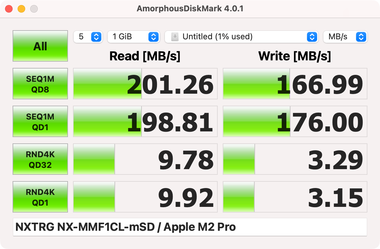 ベンチマークを取得してみたところ、確かに200MB/sの読み取り速度が実現できていました。特に動画撮影ではあっという間にファイル容量が膨れ上がるので、高速な読み取りができるのは便利です。転送時間を気にせず撮影を楽しみたいと思います。