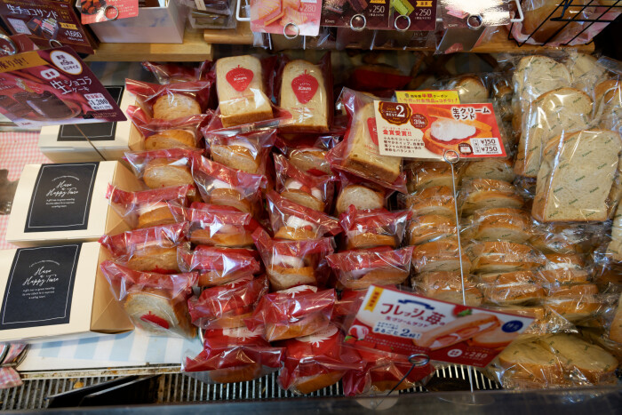 生クリームサンドは看板商品だけあってまとまったスペースが確保されていました。苺そのものを使ったフレッシュ苺とモンブランが季節商品です。