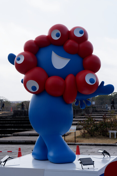 2025年大阪・関西万博の会場で多くの来場者を迎えたミャクミャクのモニュメント「いらっしゃい」と「ワクワク」が、ここ万博記念公園に移設されたのです。梅のついでにひと目見ておこうというわけです。フォトスポットは長蛇の列だったので、遠くから見るのみでした。行列を見ると万博を思い出しますね。