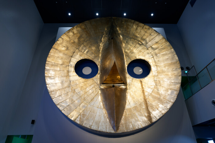 ミャクミャクの移設に合わせて多くのイベントが開催されていました。イベントの一環で、1970年大阪万博の記念館であるEXPO’70 パビリオンが入場無料になっていたので、足を運んでみました。こちらは初代の黄金の顔です。風雨による劣化の恐れがあったため、1992年の改修工事で取り外されたものです。直径約10mの大きさに圧倒されますね。