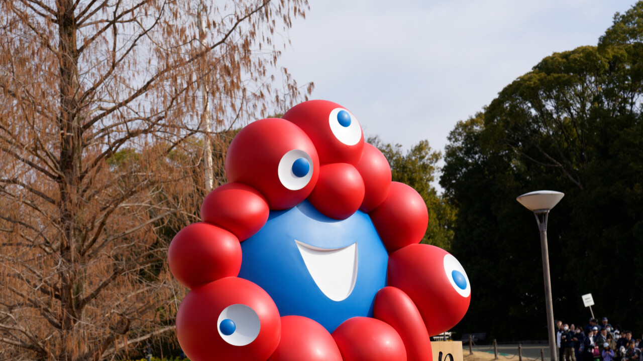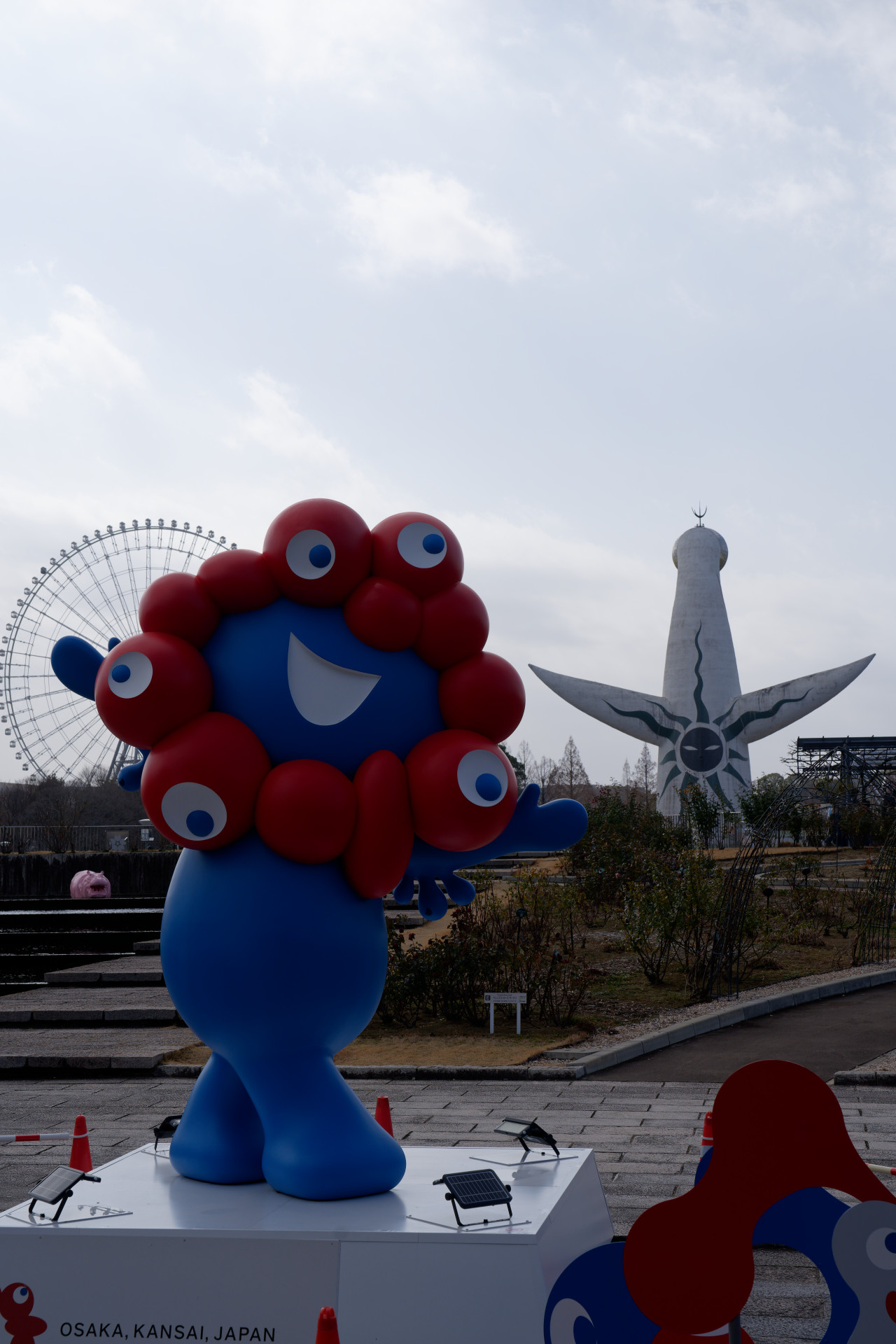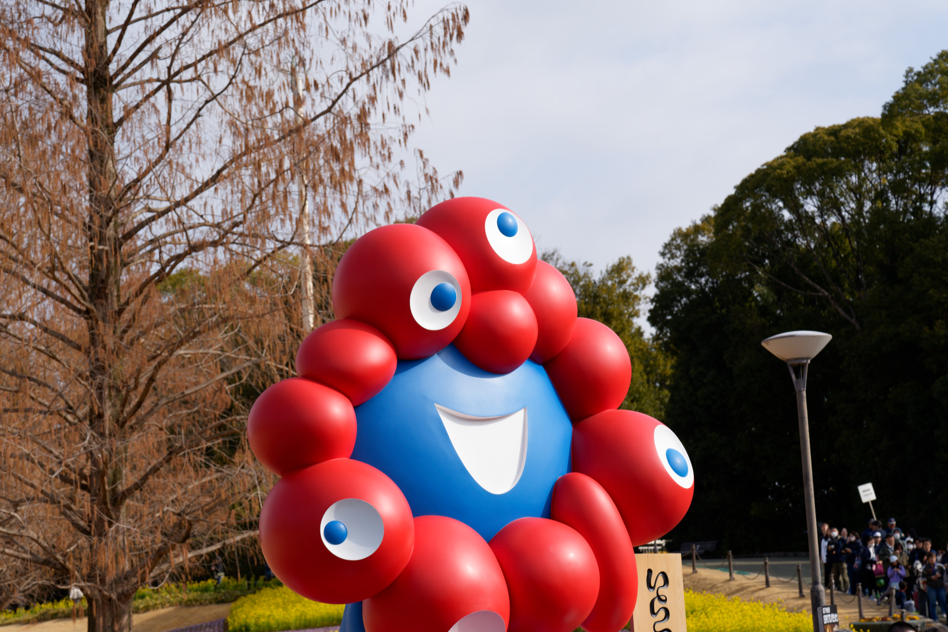 2025年大阪・関西万博の会場で多くの来場者を迎えたミャクミャクのモニュメント「いらっしゃい」と「ワクワク」が、ここ万博記念公園に移設されたのです。梅のついでにひと目見ておこうというわけです。フォトスポットは長蛇の列だったので、遠くから見るのみでした。行列を見ると万博を思い出しますね。