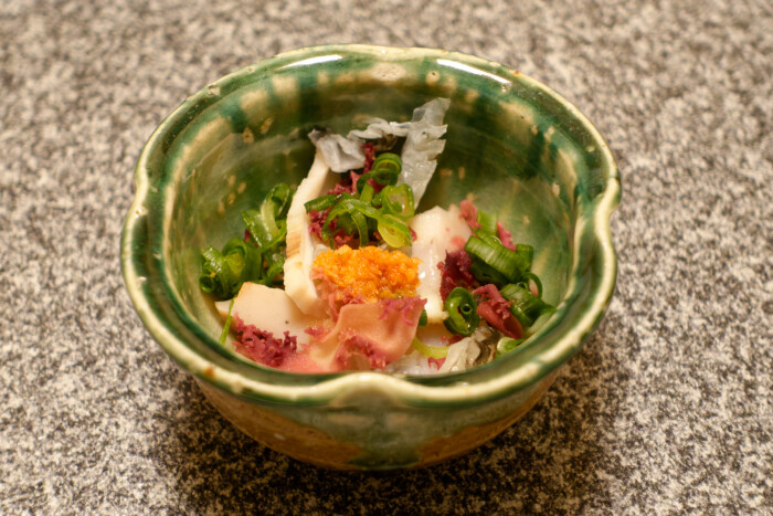 さっそく付出からコースが始まります。皮の湯引きで、クニュッとした食感で楽しい。