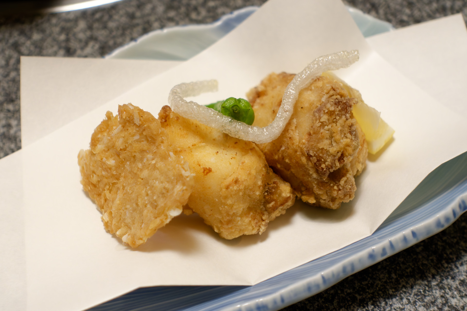 唐揚げです。特製のタレに漬け込まれていて、クエの身の味と相性抜群です。揚げたてアツアツなのも嬉しい。