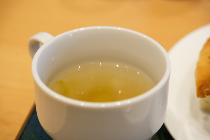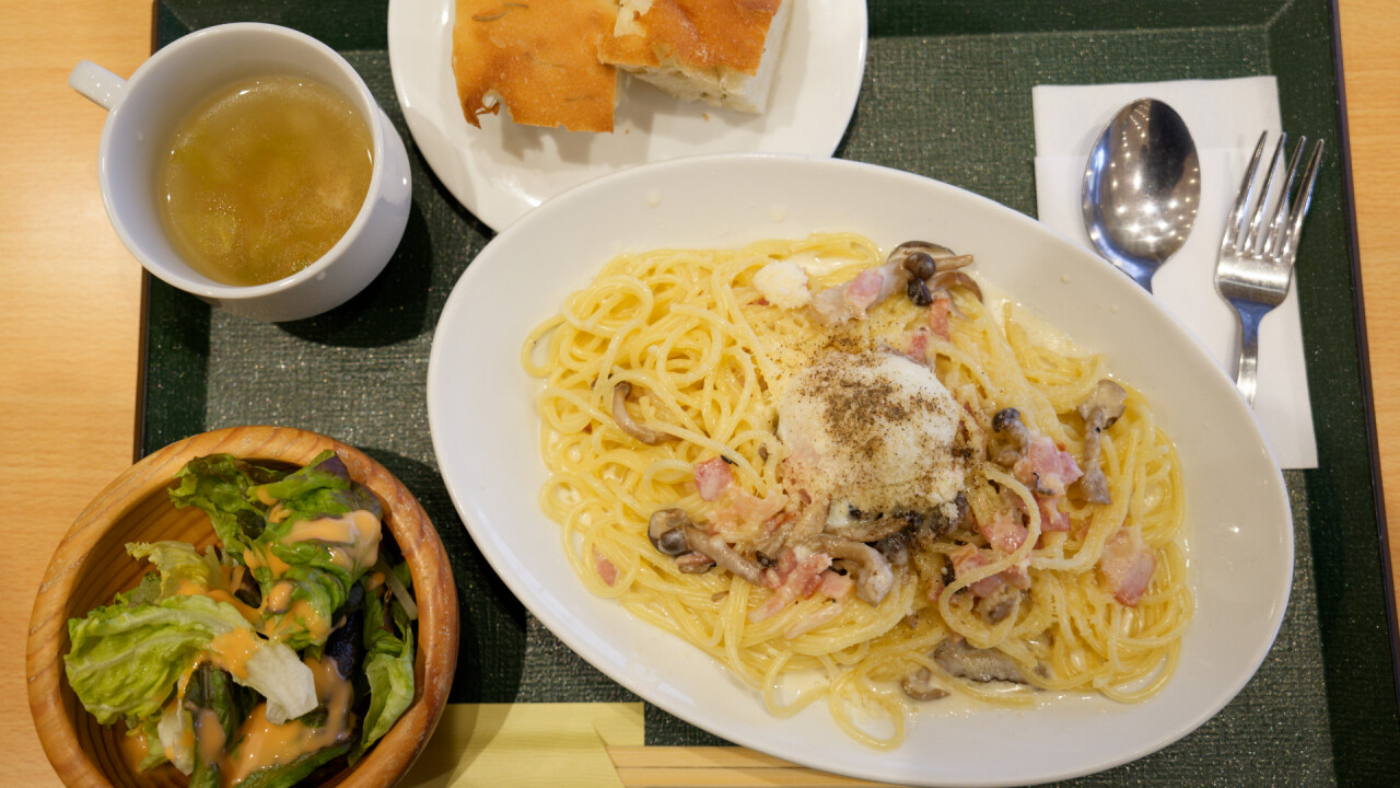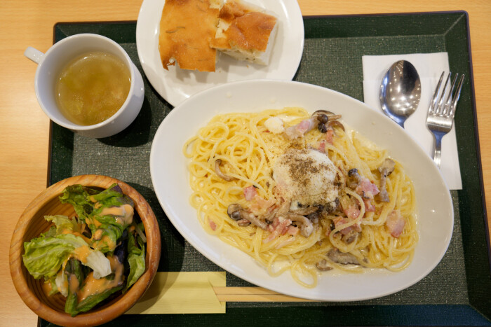 あれこれ迷って、カルボナーラにパンを追加しました。サラダとスープはどのメニューでもセットされています。