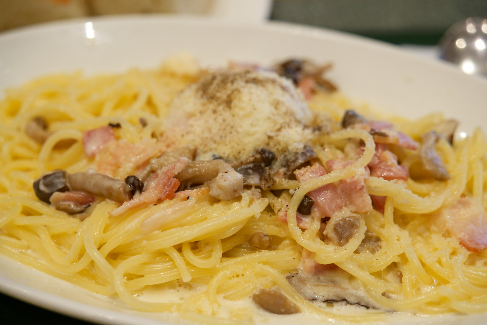 カルボナーラは大盛りにしてみました。ベーコンとキノコの定番に加えて、半熟卵のトッピングが嬉しい。