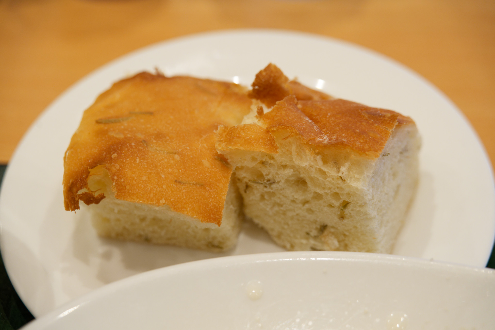 パンはハーブが効いた爽やかな風味のフォカッチャです。パスタのお供にぴったり。