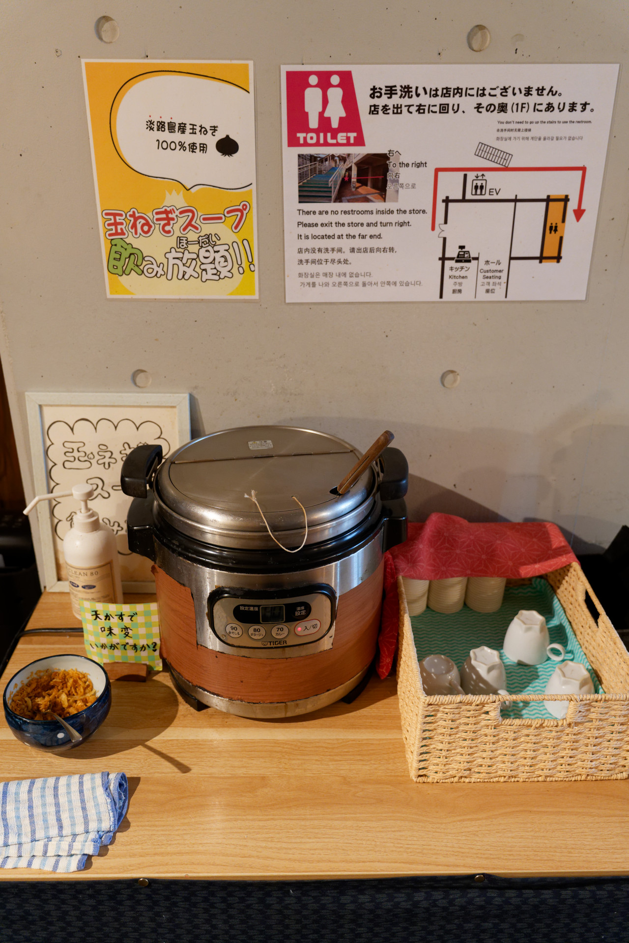 セットには玉ねぎスープがついてきます。セルフサービスでおかわり自由。味変のためのオニオンフライが嬉しいですね。