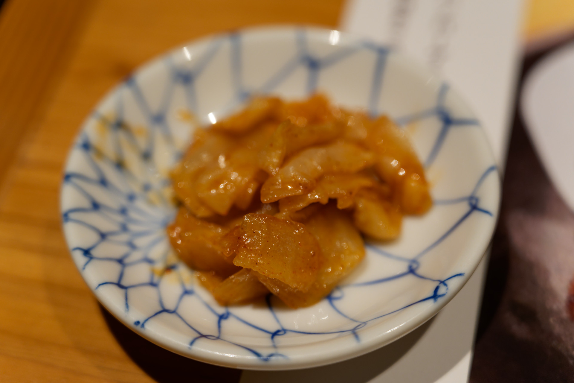 こちらは付け合わせのキムチです。なんと玉ねぎのキムチとのこと。珍しい。さほど辛くなく、ご飯のお供やご飯の箸休めにぴったりです。
