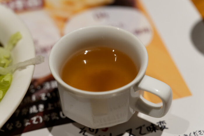 オニオンスープはほどよい塩気と旨みで美味。この日は肌寒かったので、温かいスープが沁みました。