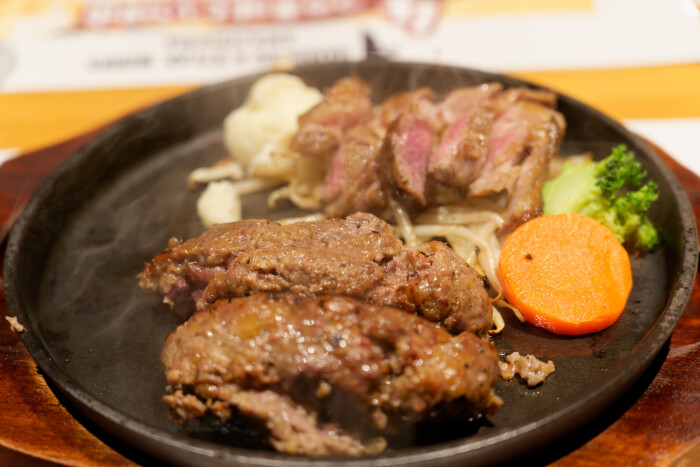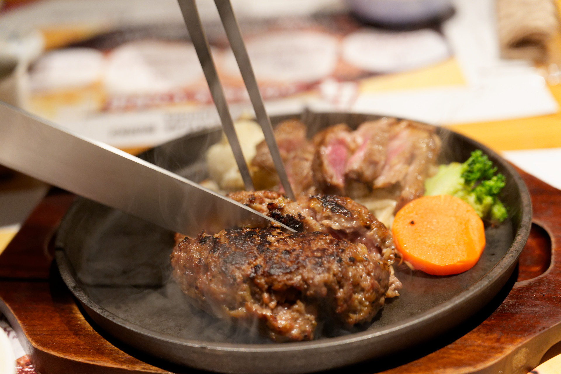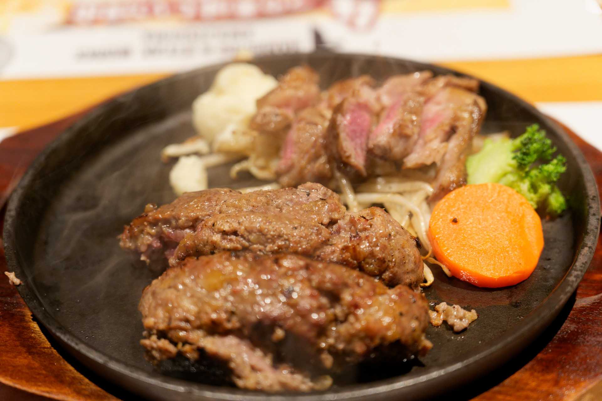 しばし待つと、メインの登場です。ハンバーグとステーキのコンボプレートにしました。ハンバーグは卓上で半分に切って仕上げるスタイルです。