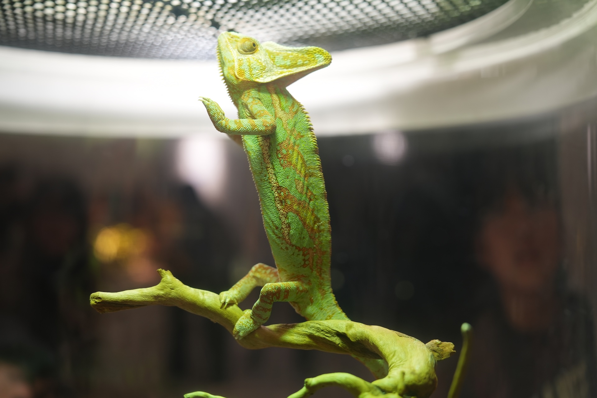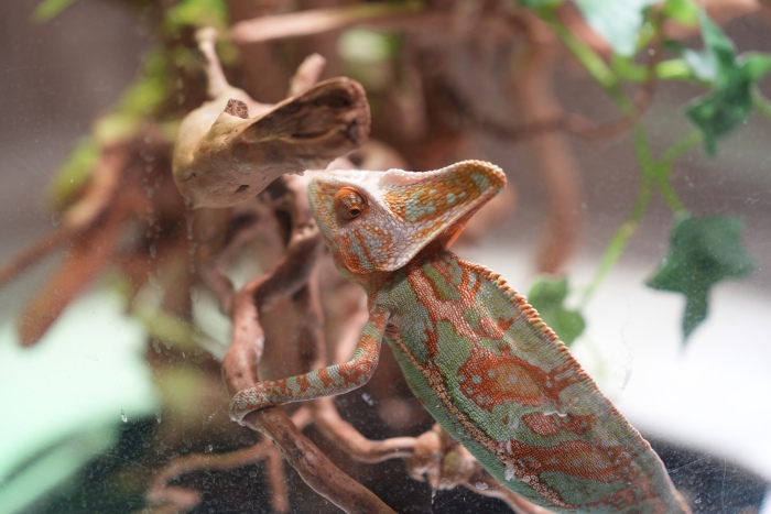 かくれる、と言えばこの方、カメレオンです。体色が変化することで有名ですね。こちらのカメレオン君は活発に動き回っていて来場者を立ち止まらせていました。