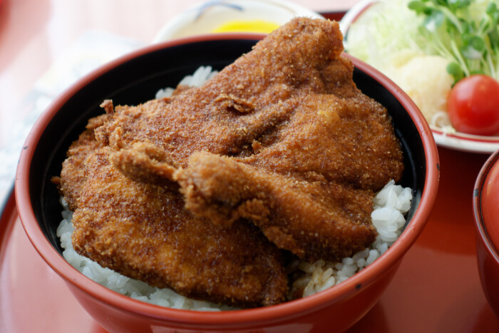 カツ丼は、たれのかかったご飯の上にたれをつけたカツが3枚載せられた丼です。ご飯はそれなりに盛りがよいので、場合によってはミニ丼を検討してもよいかもしれません。たれ仕上げのカツはアツアツのサクサクで、ソースの風味と合わせて楽しめます。ソースカツと聞いてもう少ししっとりした食感を想像していましたが、想像以上にサクサクですね。