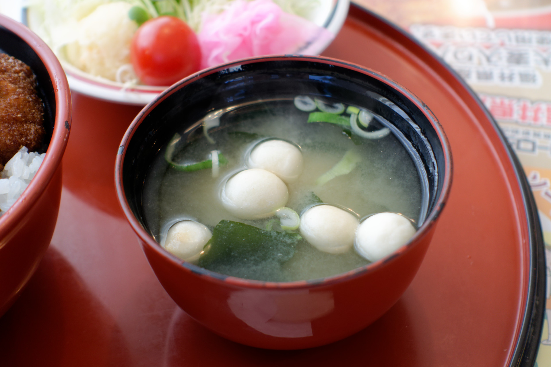 セットのみそ汁です。麩とわかめ、それにネギの食感が鮮やか。