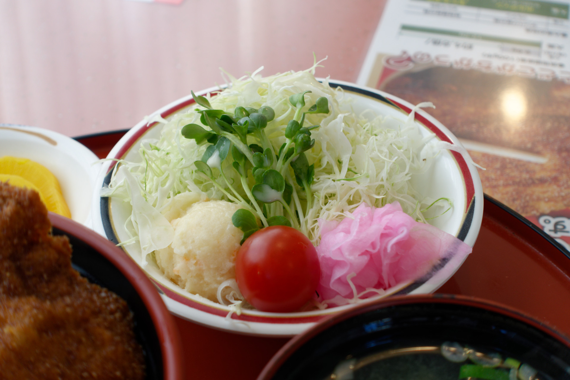 メニューは丼ものが中心です。サイドメニューとして、ミニサラダとみそ汁をセットできます。