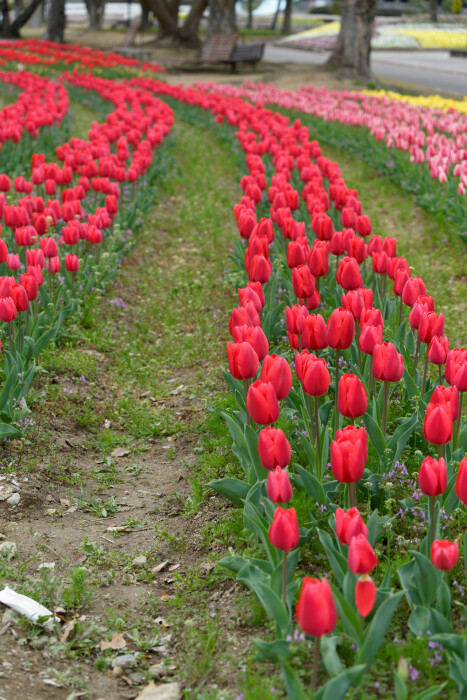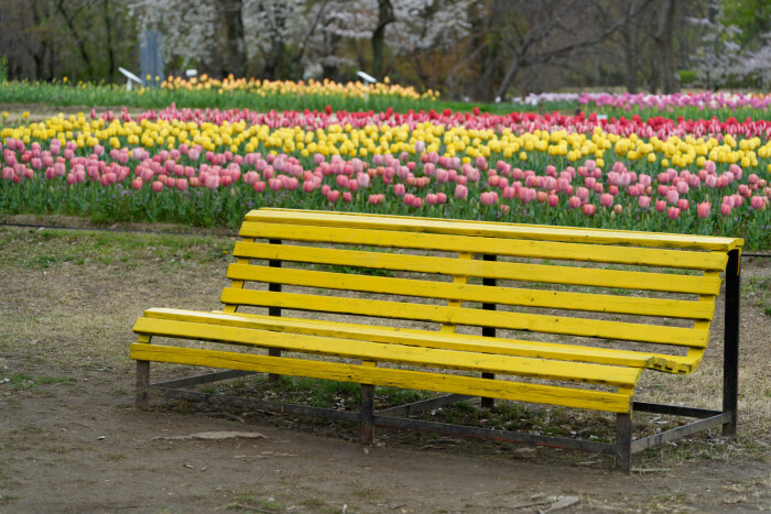 黄色く塗られたベンチとカラフルなチューリップが、曇り空の下でも華やかさを演出していました。