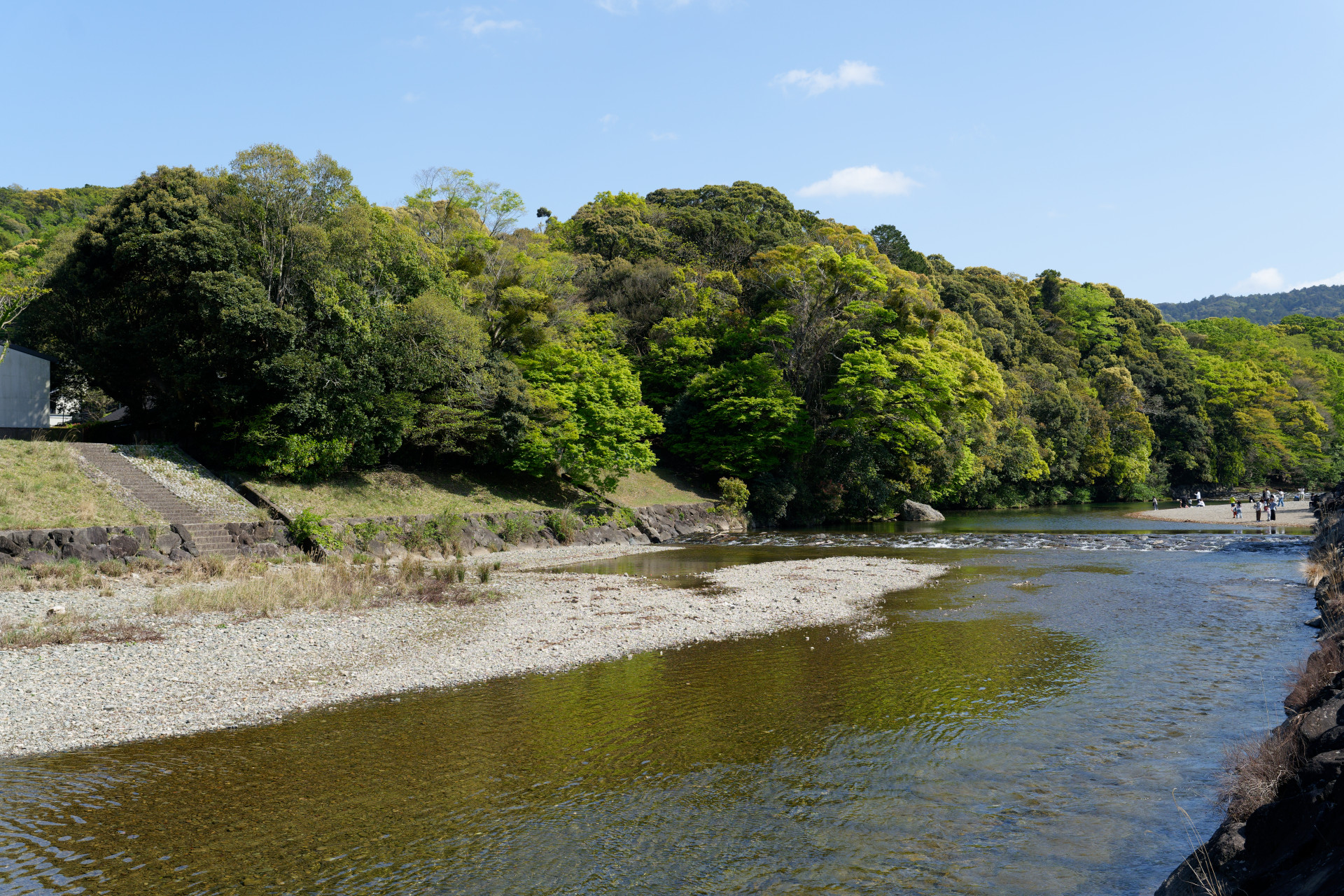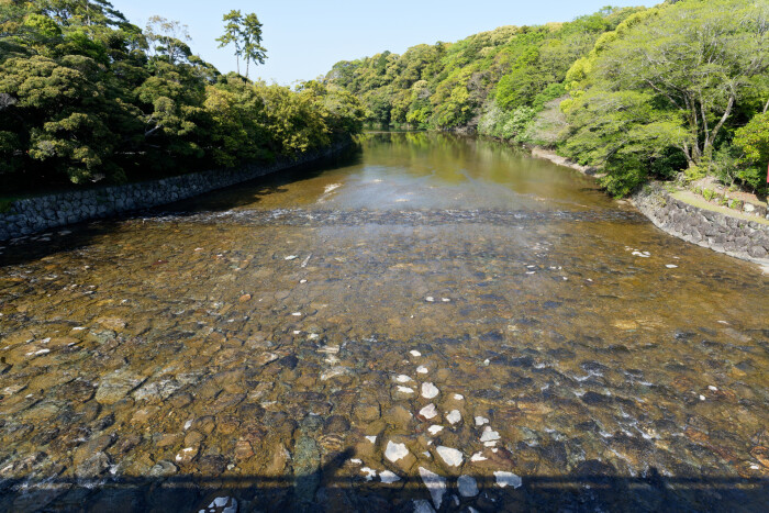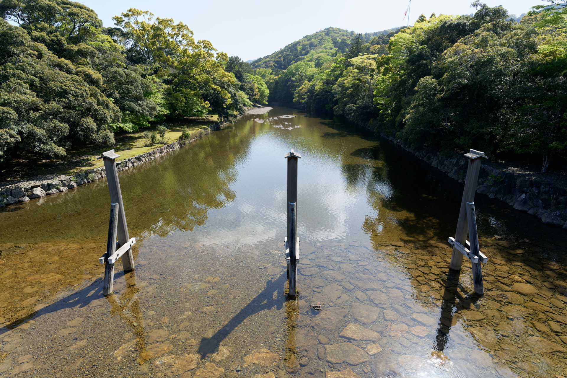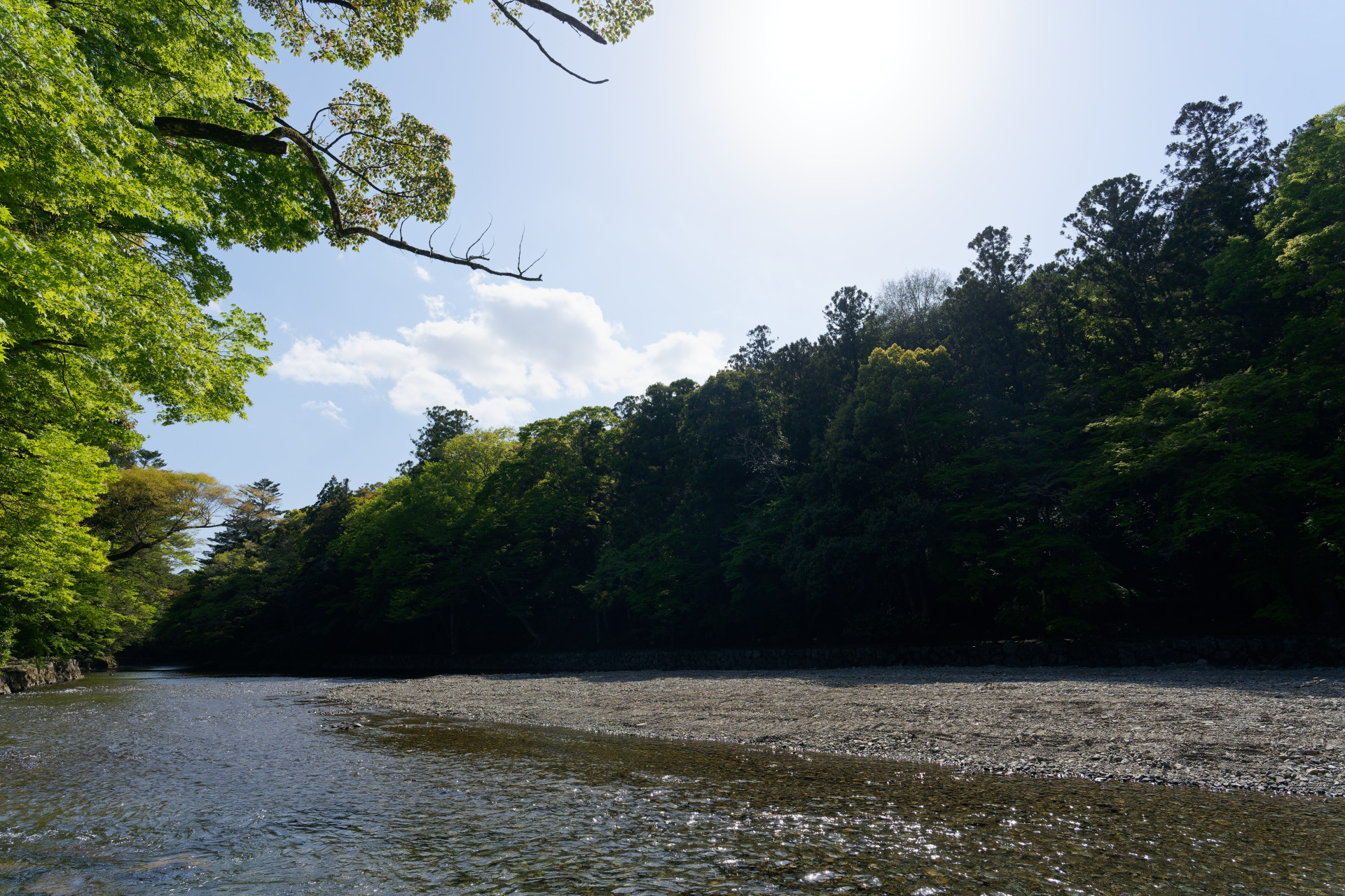 今回は内宮のみ、五十鈴川のそばを歩いていきます。この日は晴天で暑いくらい。季節の移り変わりが実感できる天候でした。